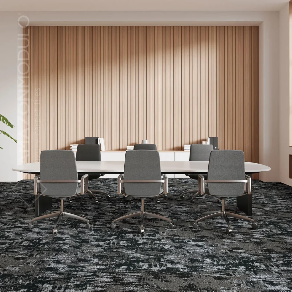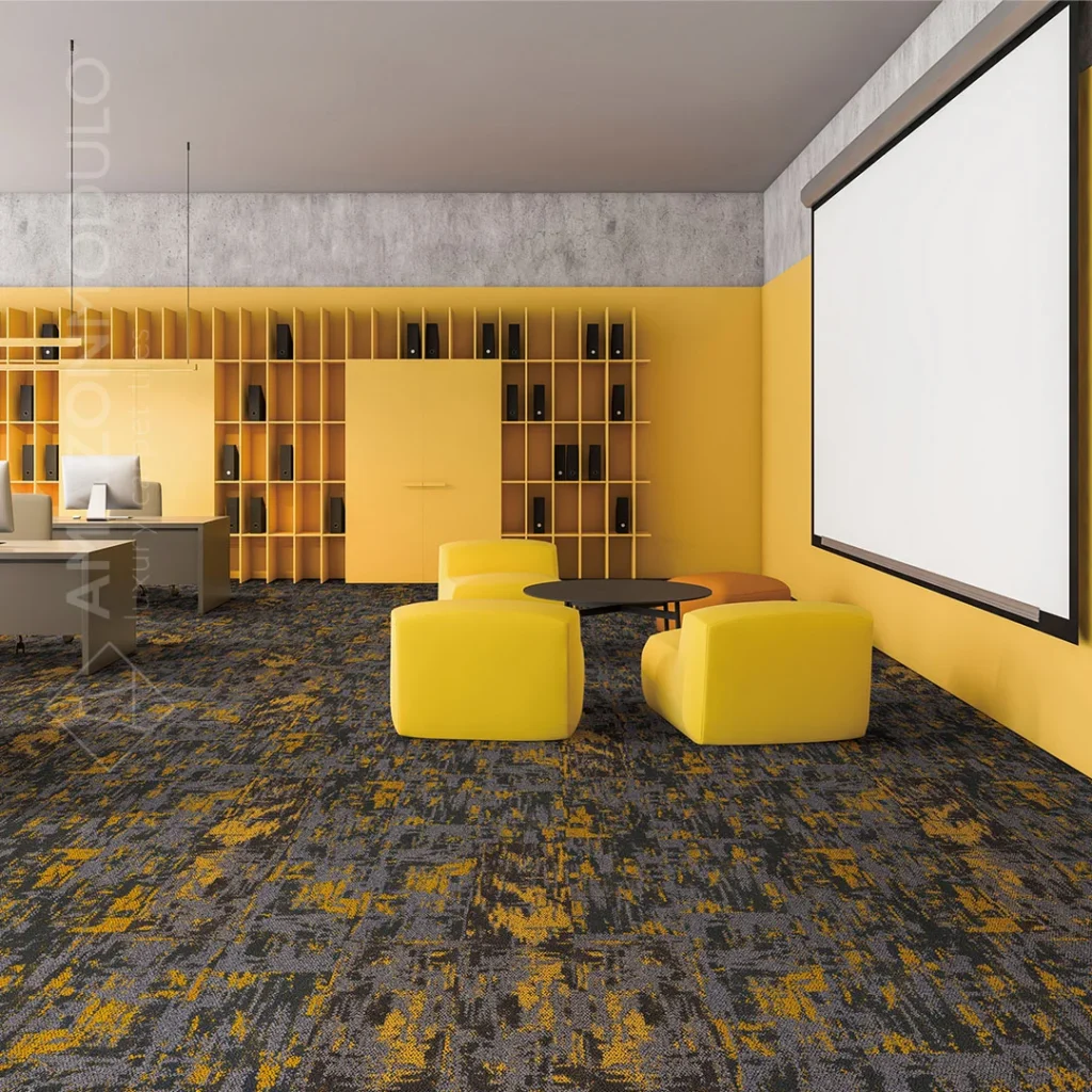 PP carpet tiles in plank format on bitumen backing in abstract motif