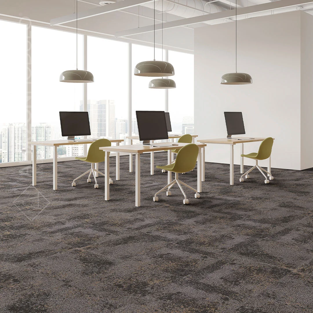PP carpet tiles on bitumen backing in abstract motif