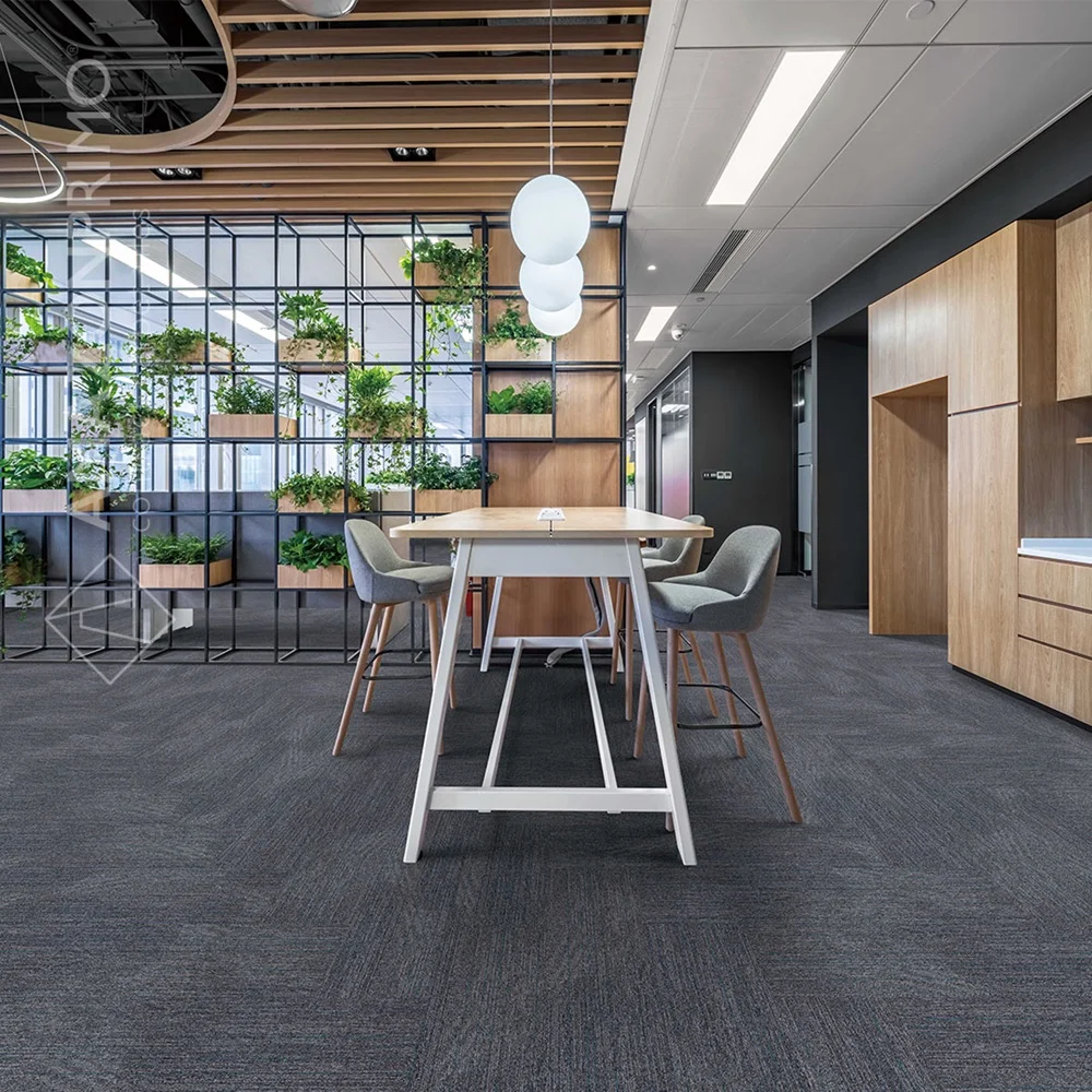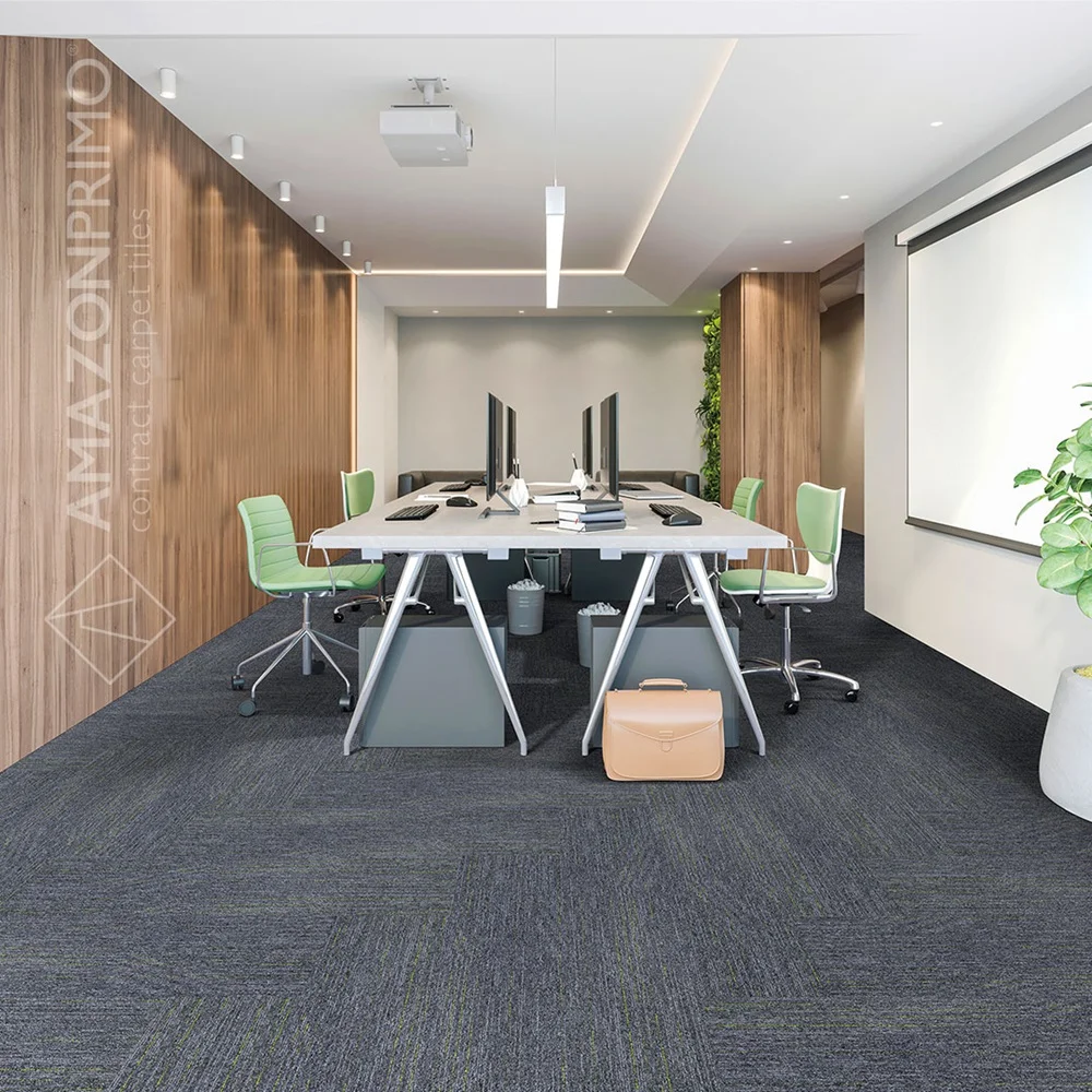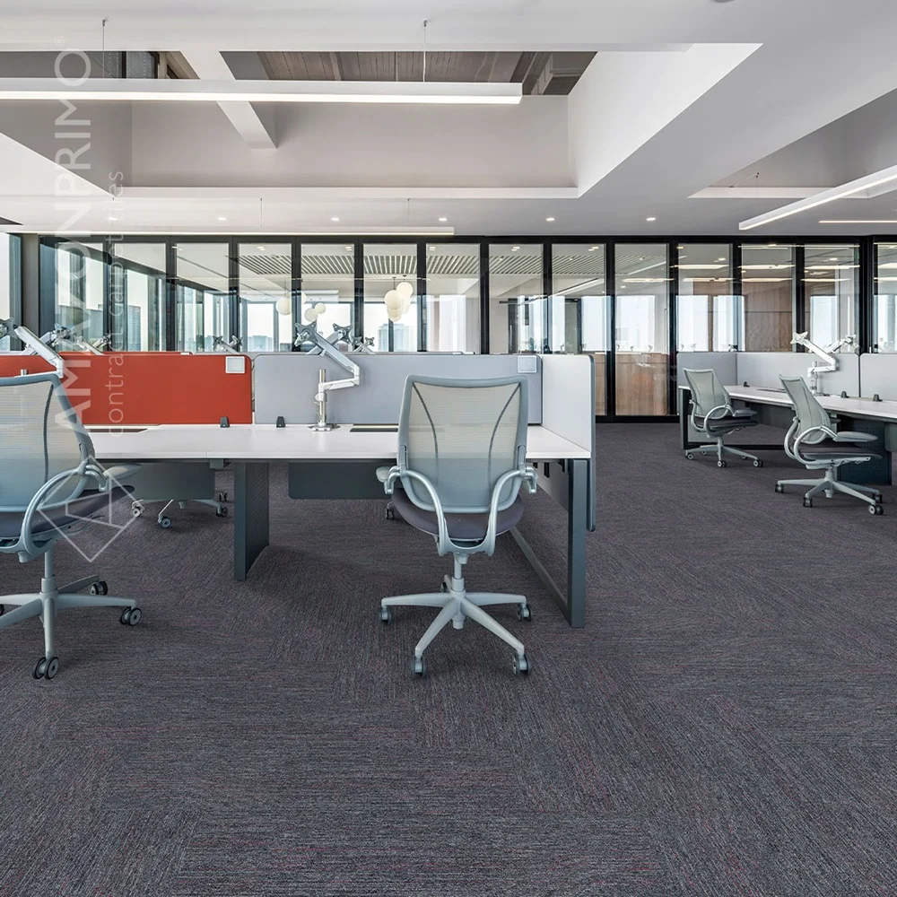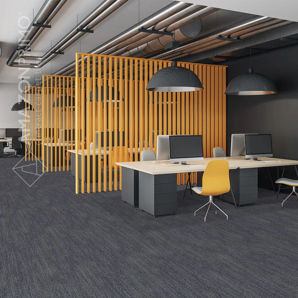 Nylon carpet tiles in plank format on PVC backing in subtle abstract motif