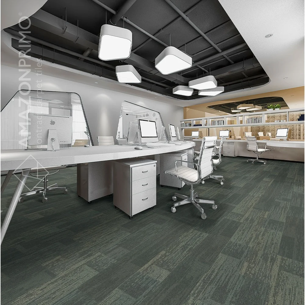 Nylon carpet tiles in plank format on PVC backing in abstract motif